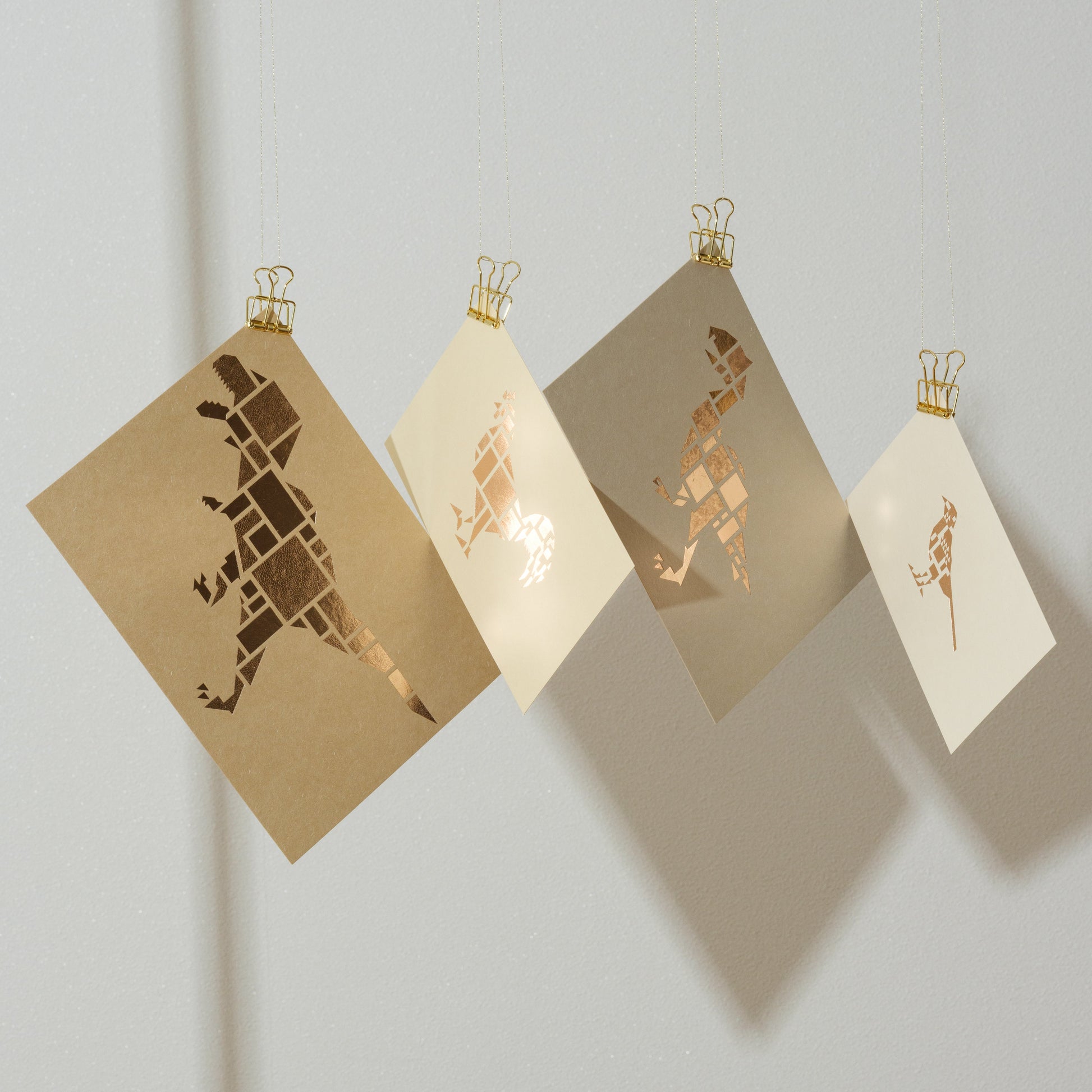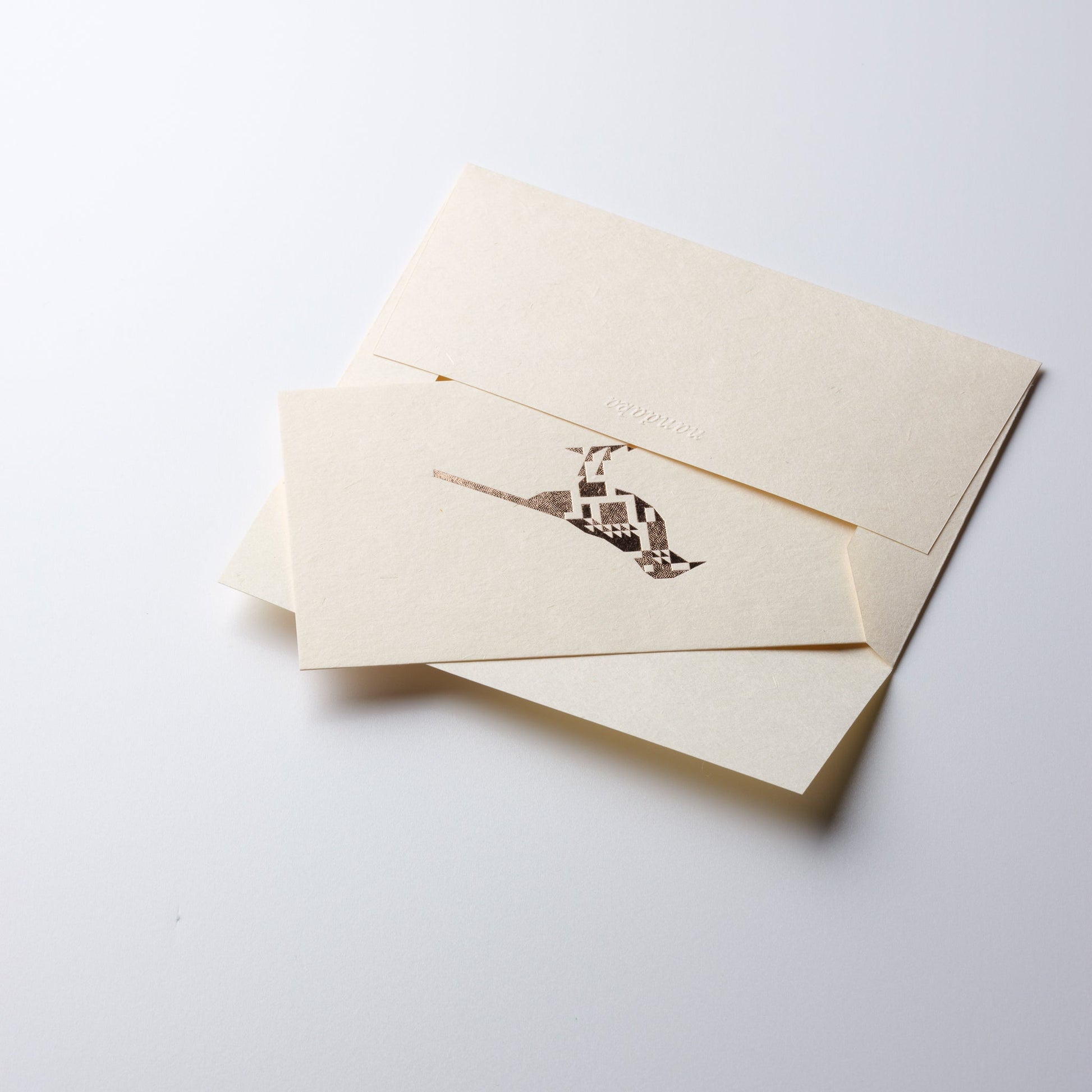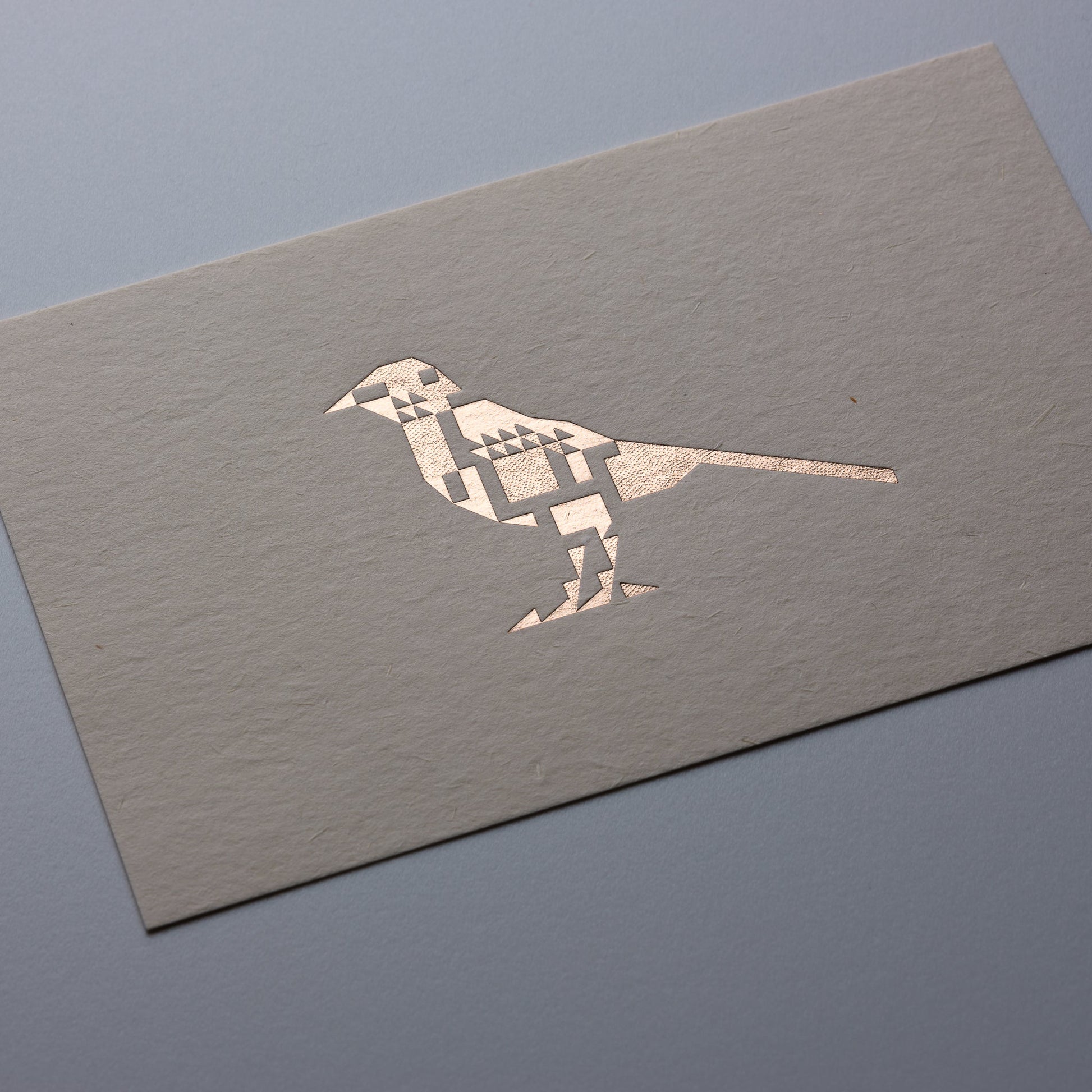 Birds Are Dinosaursシリーズより、ハクセキレイのカード(封筒付き)です。ガサガサふかふかとした土のような感触の紙に、ピンクゴールドの箔押し。箔押しには微細な模様が入っている部分と入っていない部分があり、複雑で生き生きとした輝きを生み出しています。