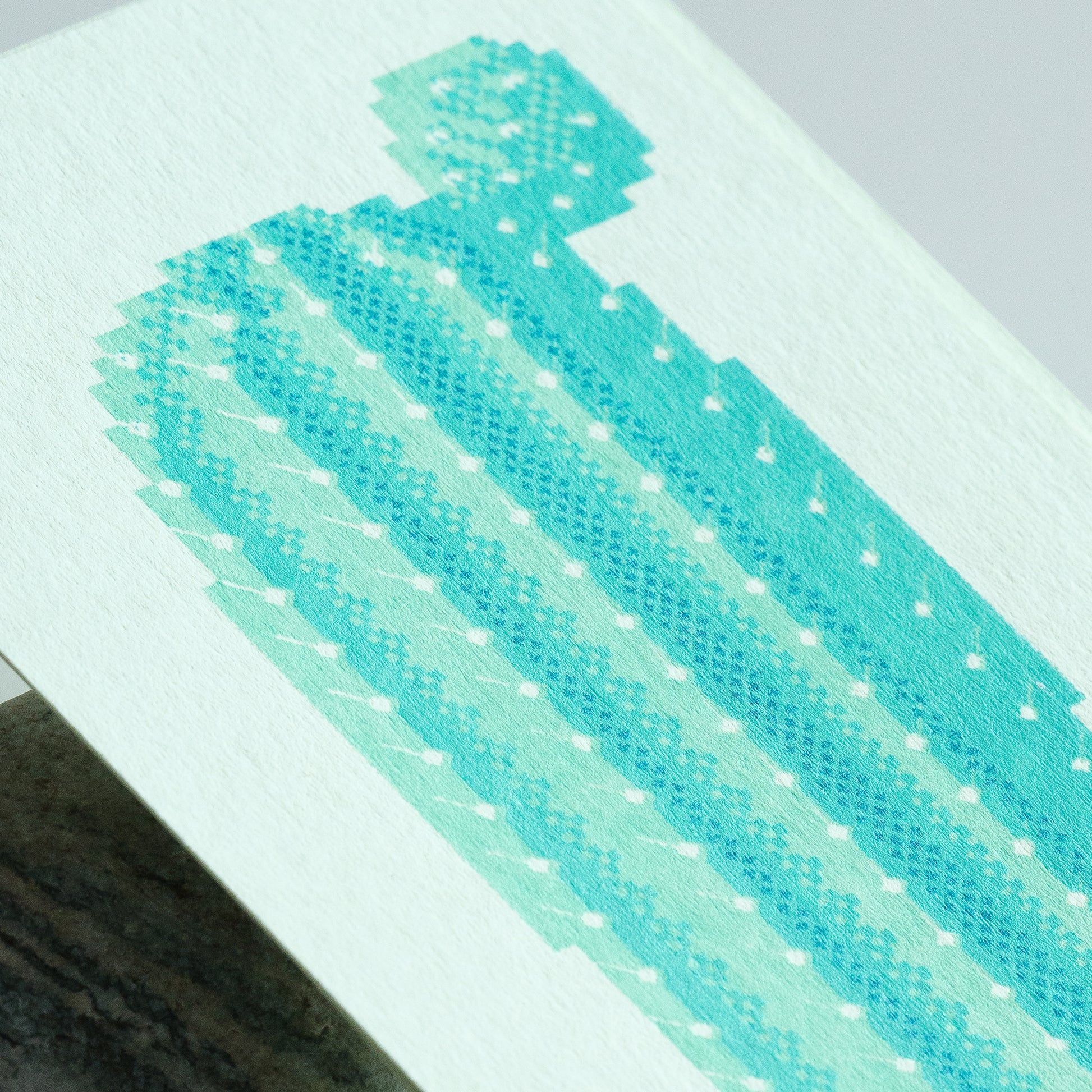 シーフォームグリーン、ミントグリーン、ターコイズグリーン、ピーコックグリーンの4種類の緑色でできたサボテンのポストカードです。