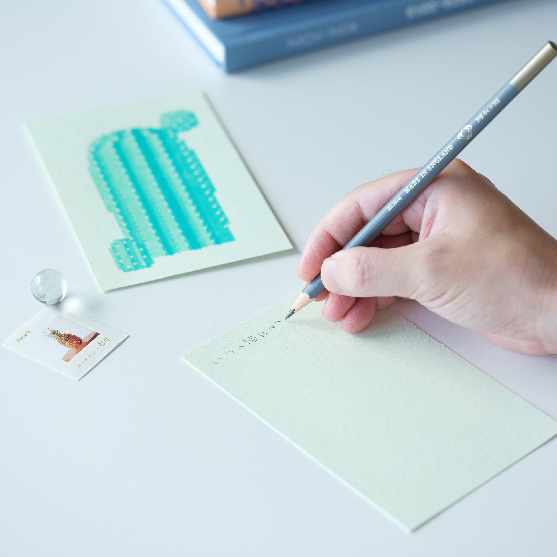厚手でしっかりとした硬さがあるのに優しい手触りが感じられるシーフォームグリーン色の高品質なカード紙へ、ミントグリーン、ターコイズグリーン、ピーコックグリーンのインクの順にシルクスクリーンで3回重ね刷り。清涼感いっぱいの爽やかな一枚に仕上がりました。