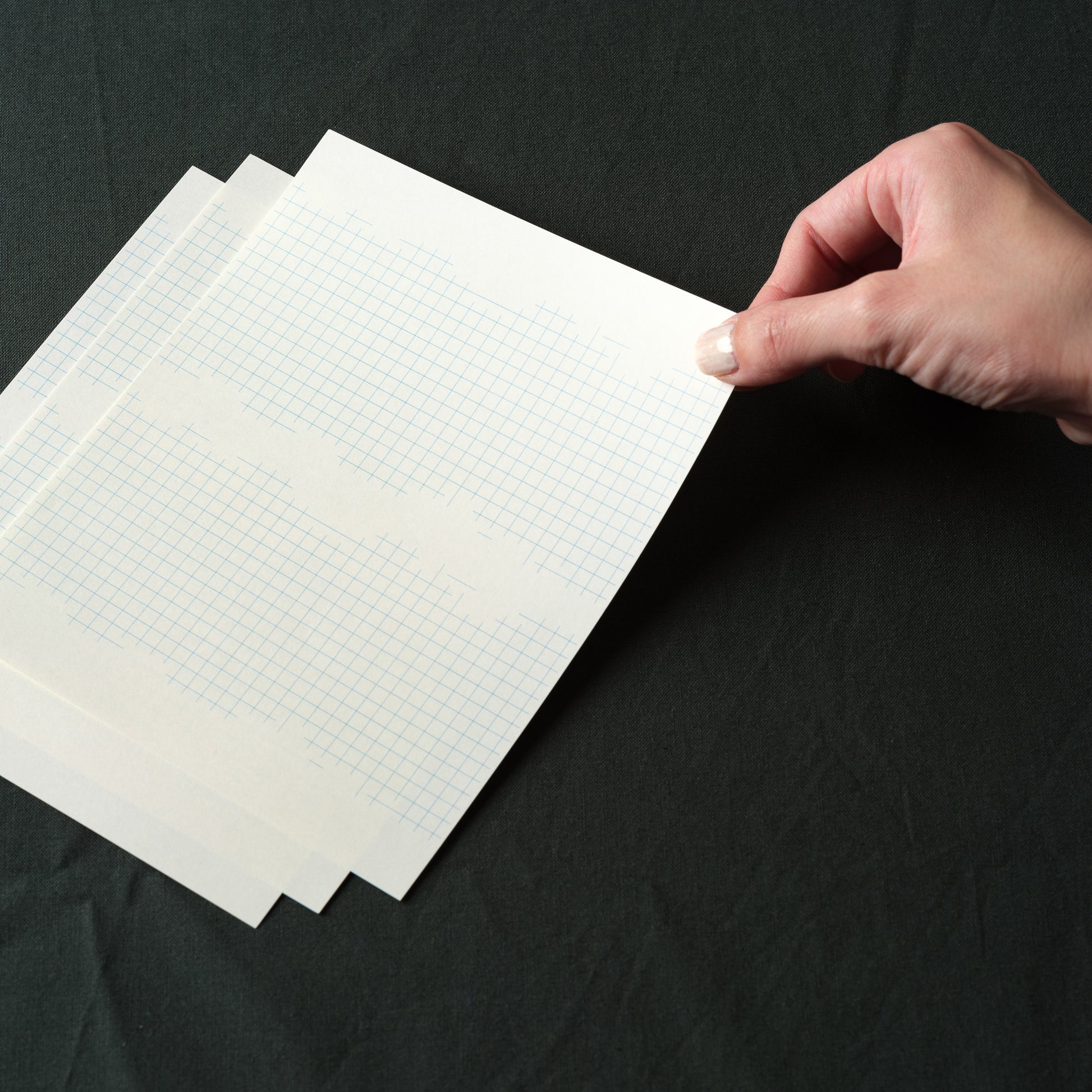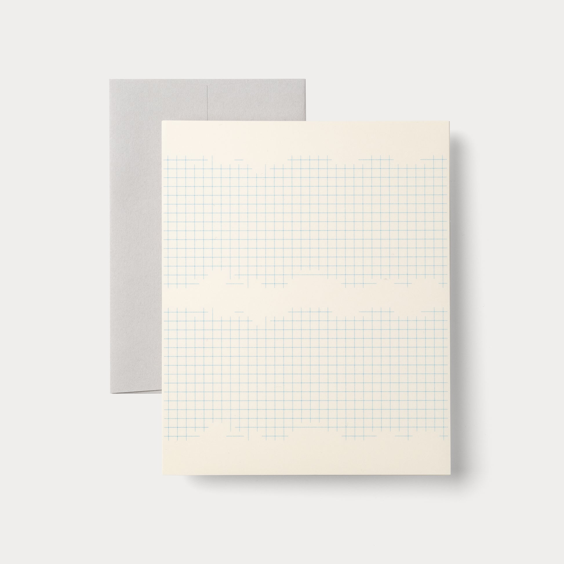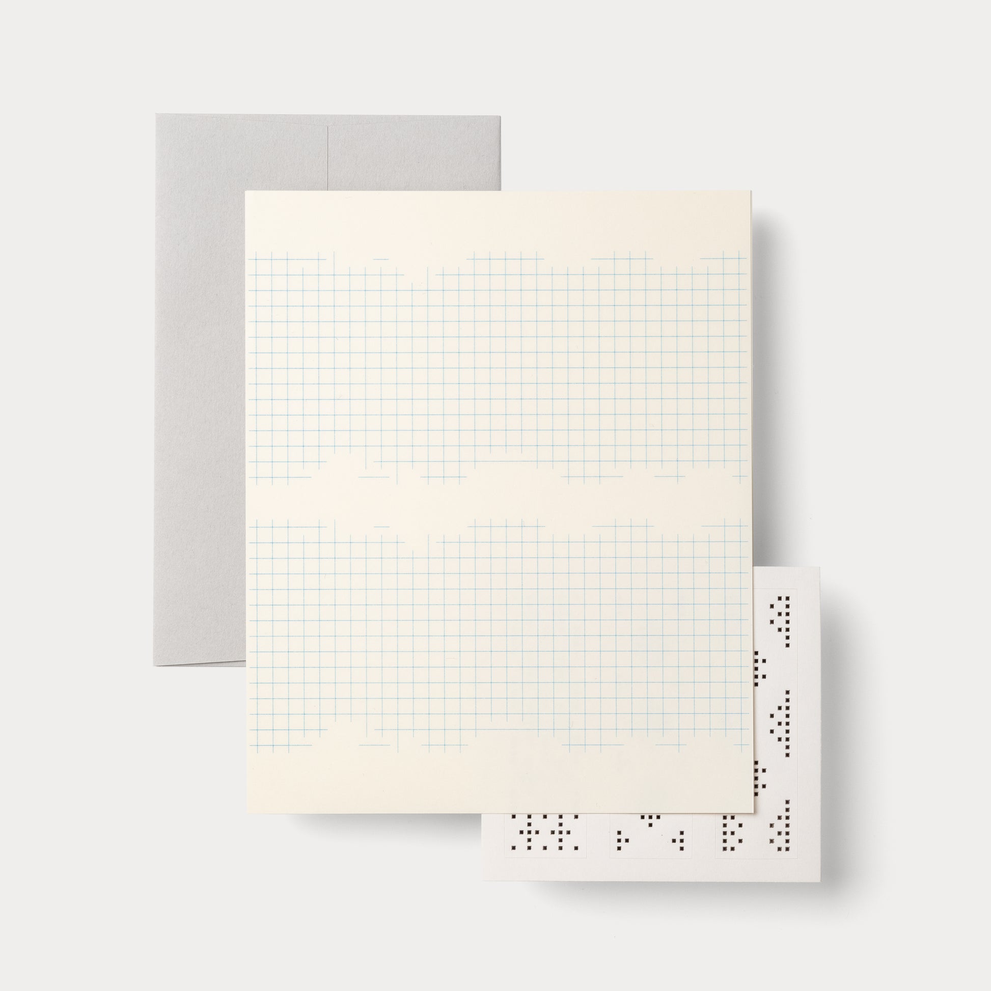 方眼ノートの字や図・絵の書きやすさはそのままに、手紙として成り立つ様式にデザインした新しい便箋です。一枚の方眼紙に消しゴムをかけて無意識に形作られたような不規則な輪郭が、このGrid #1の最大の特徴になっています。真ん中の余白は封筒へ入れる時の二つ折りのライン(目印)にもなり、書く時はここで一旦筆を止めて息継ぎをすることもできます。