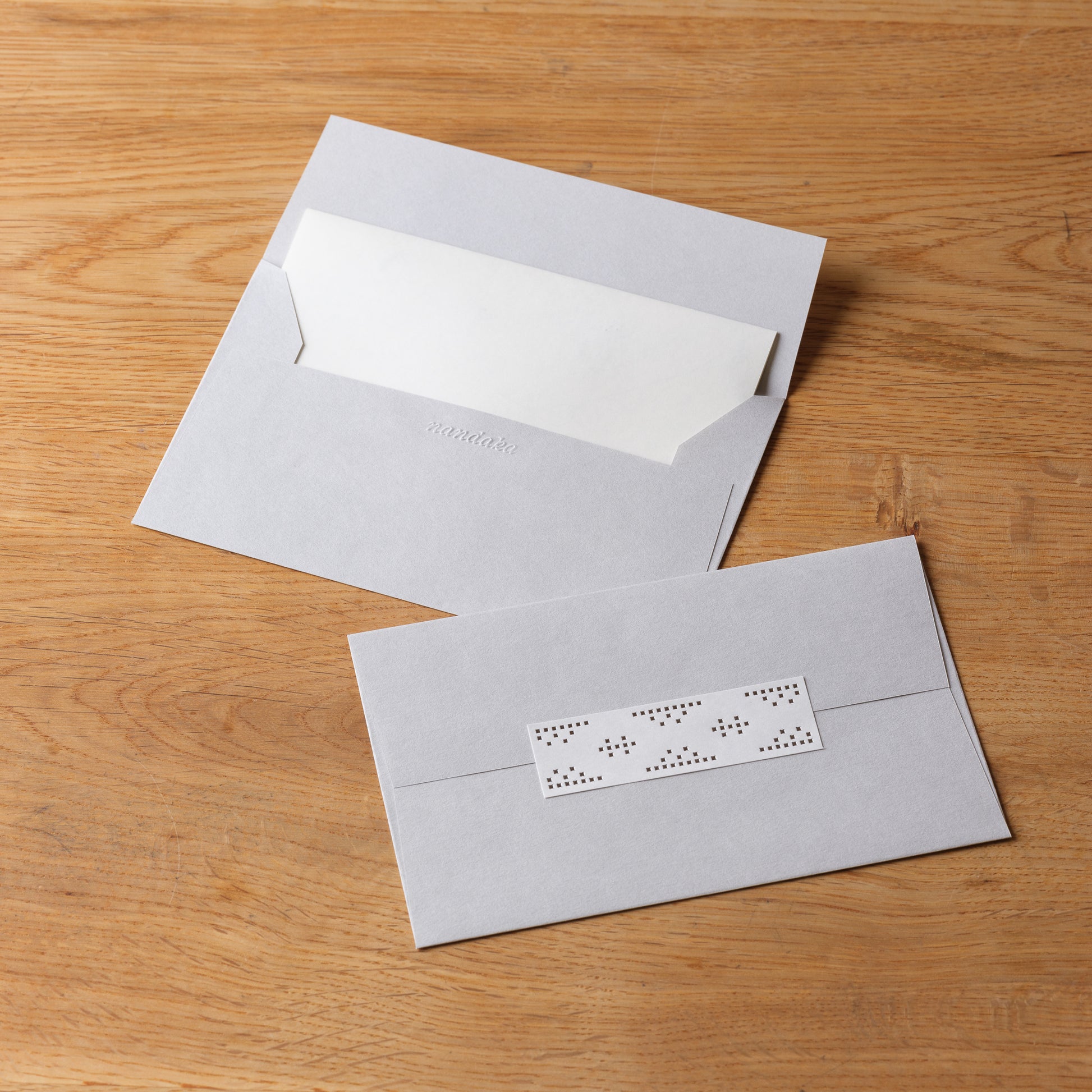 封筒の淡いグレー色は、罫線の青色に合わせて青みがかったグレーに。また3種類のシールはマス目を使って遊んだような図案です。便箋と封筒とシールがそれぞれさり気なくリンクするデザインで、シンプルすぎず、華美になりすぎず、どんな温度感の言葉も受け止められるようなバランスを探究して出来上がりました。