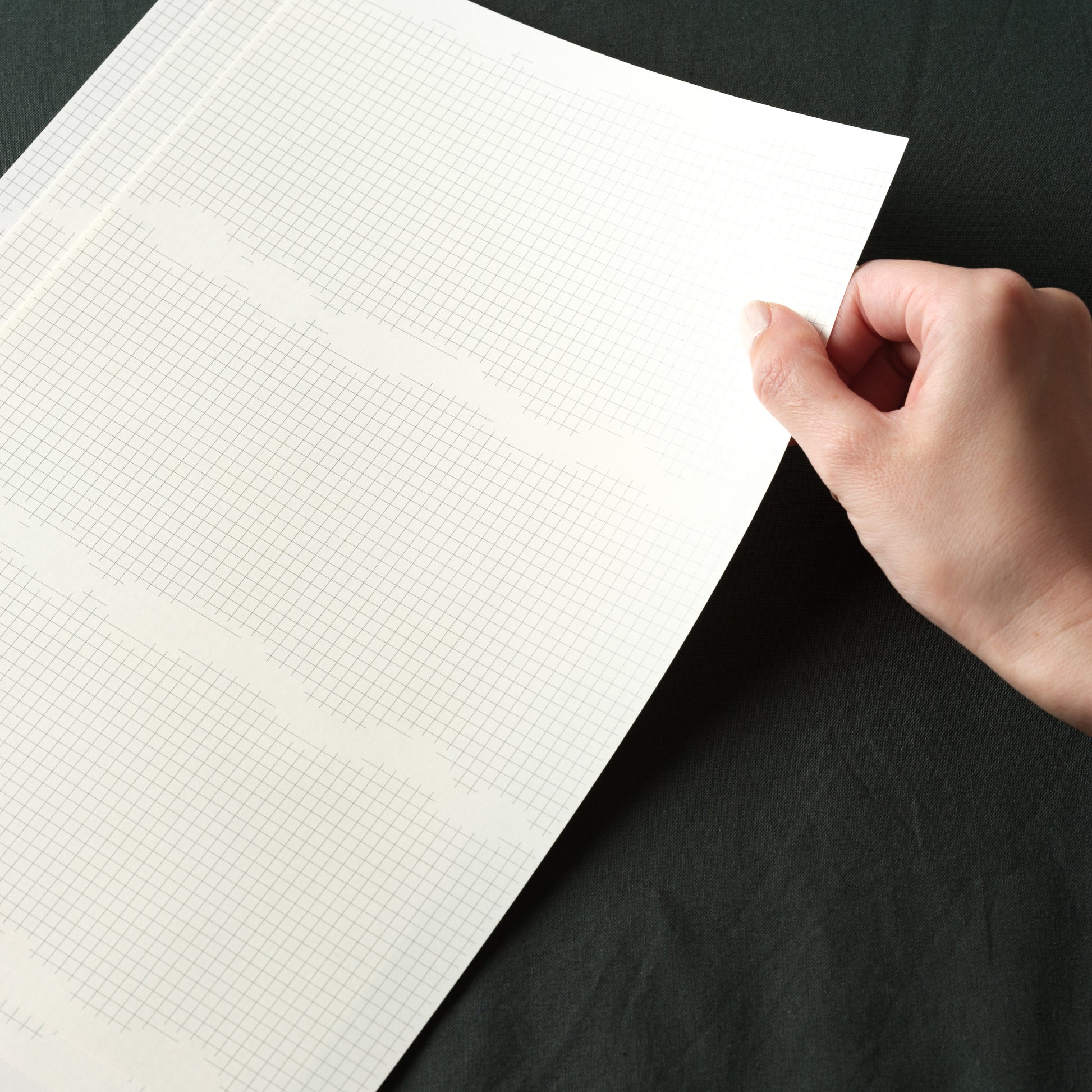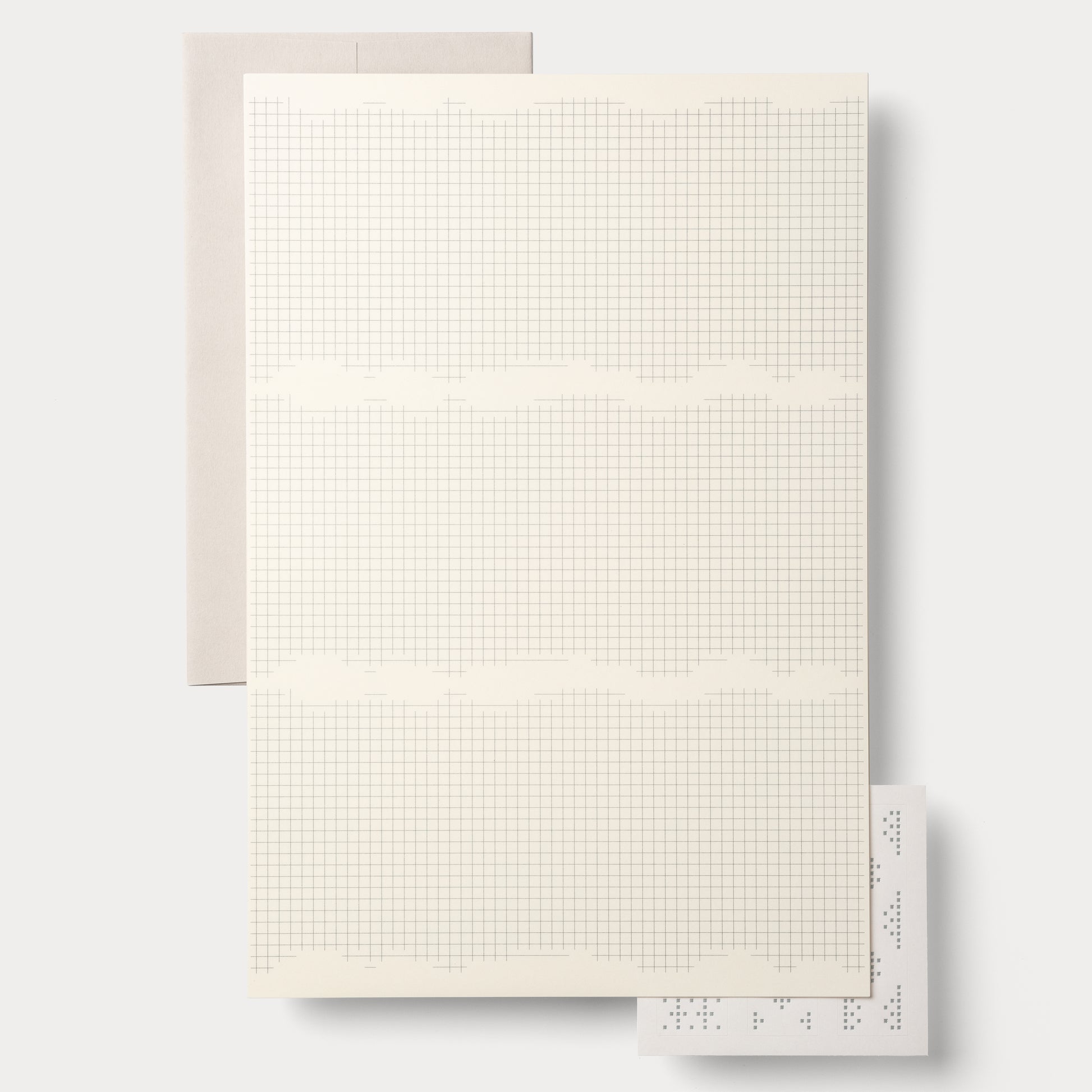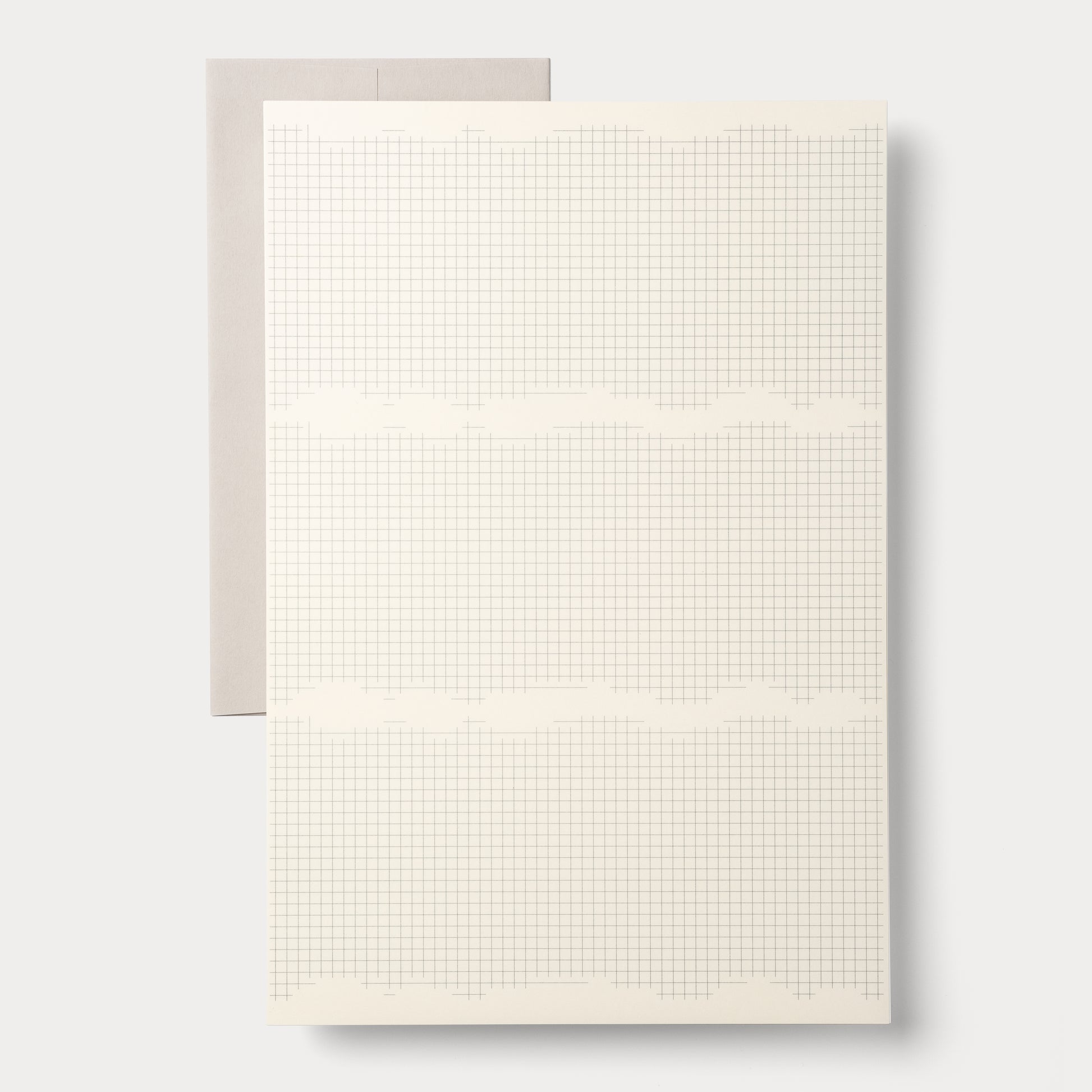 方眼ノートの字や図・絵の書きやすさはそのままに、手紙として成り立つ様式にデザインした新しい便箋です。一枚の方眼紙に消しゴムをかけて無意識に形作られたような不規則な輪郭が、このGrid #1の最大の特徴になっています。真ん中の余白は封筒へ入れる時の三つ折りのライン(目印)にもなり、書く時はここで一旦筆を止めて息継ぎをすることもできます。