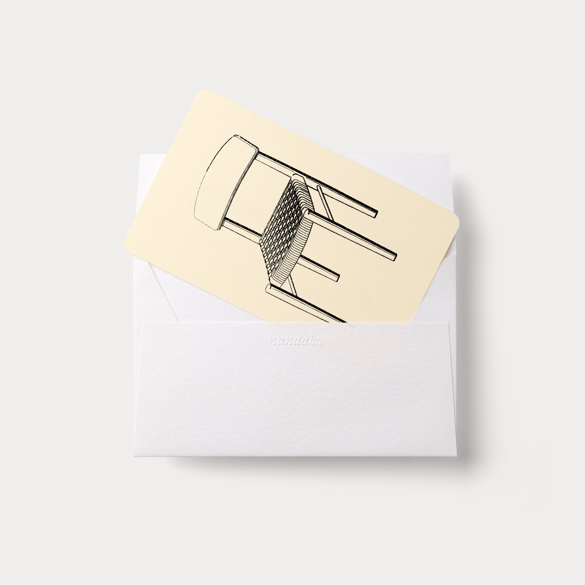 家の中での暮らしのお供になるものをテーマにしたHomeシリーズ。全31種の中から、こちらはペーパーコードの椅子をモチーフにしたカードです。