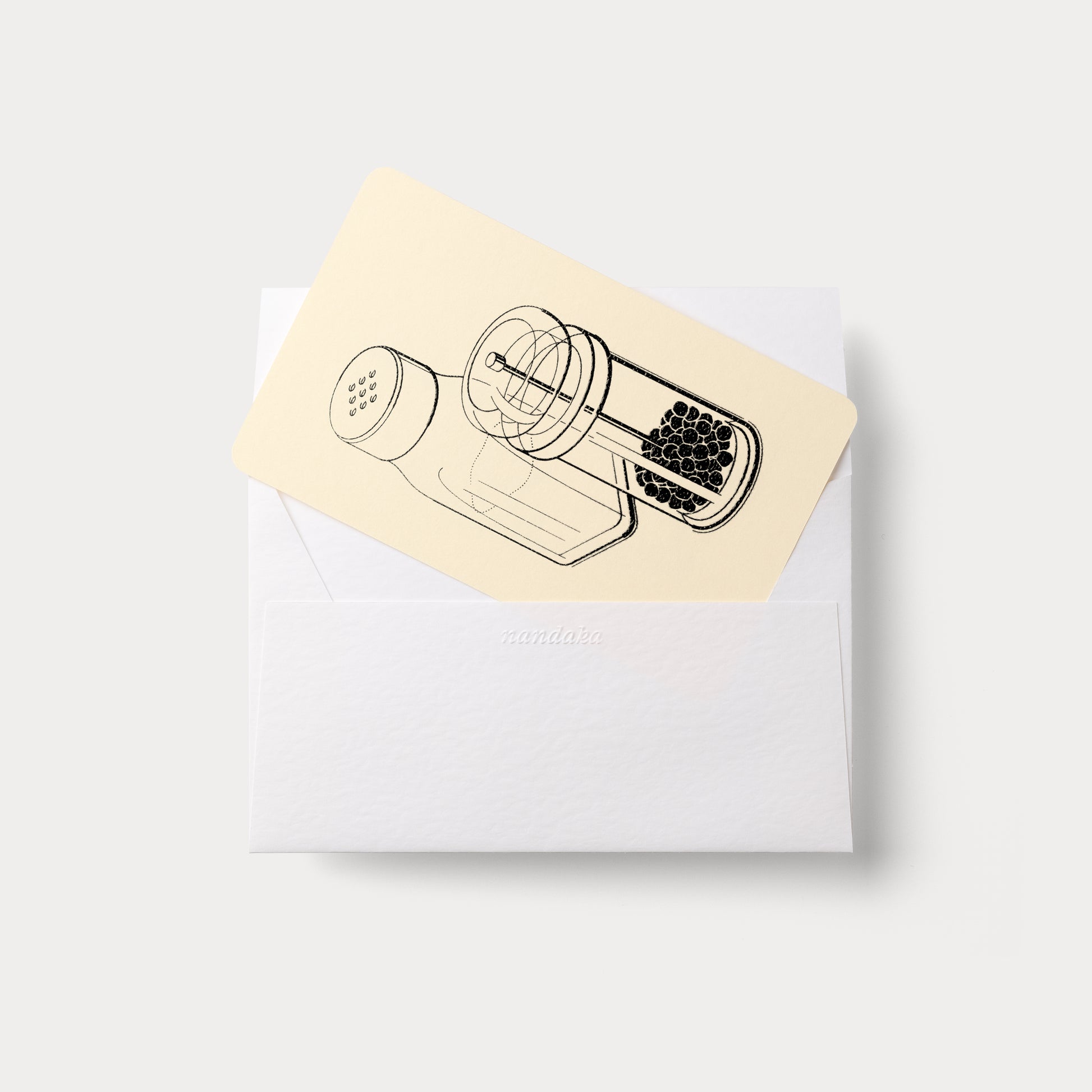 家の中での暮らしのお供になるものをテーマにしたHomeシリーズ。全31種の中から、こちらは塩と胡椒をモチーフにしたカードです。