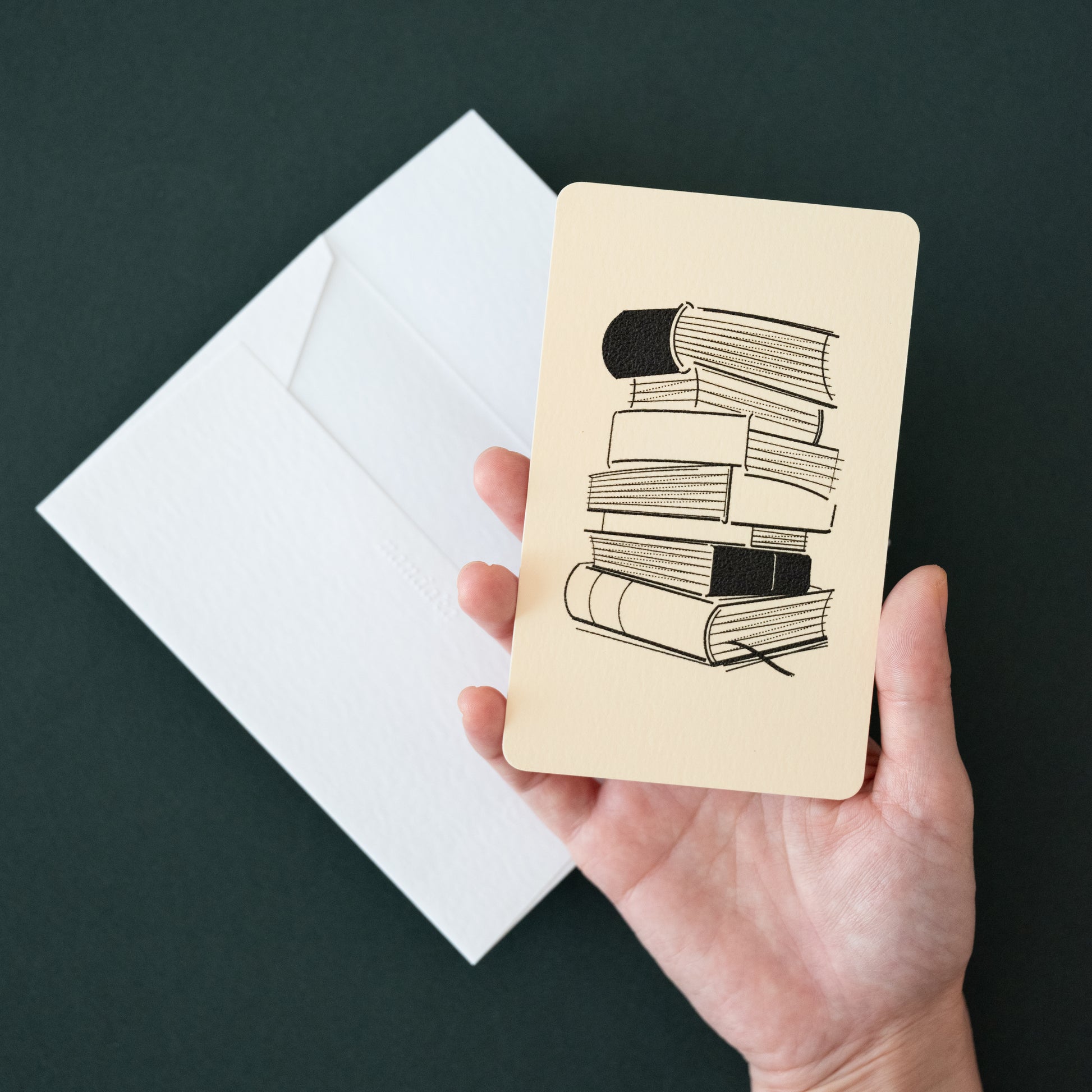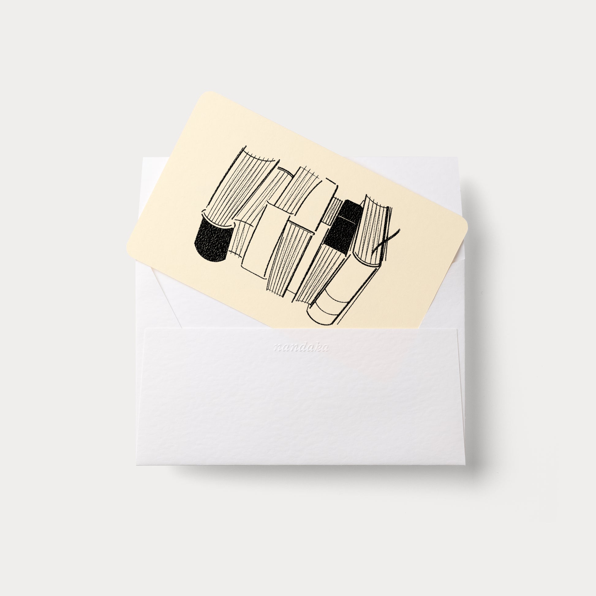 家の中での暮らしのお供になるものをテーマにしたHomeシリーズ。全31種の中から、こちらは積ん読をモチーフにしたカードです。