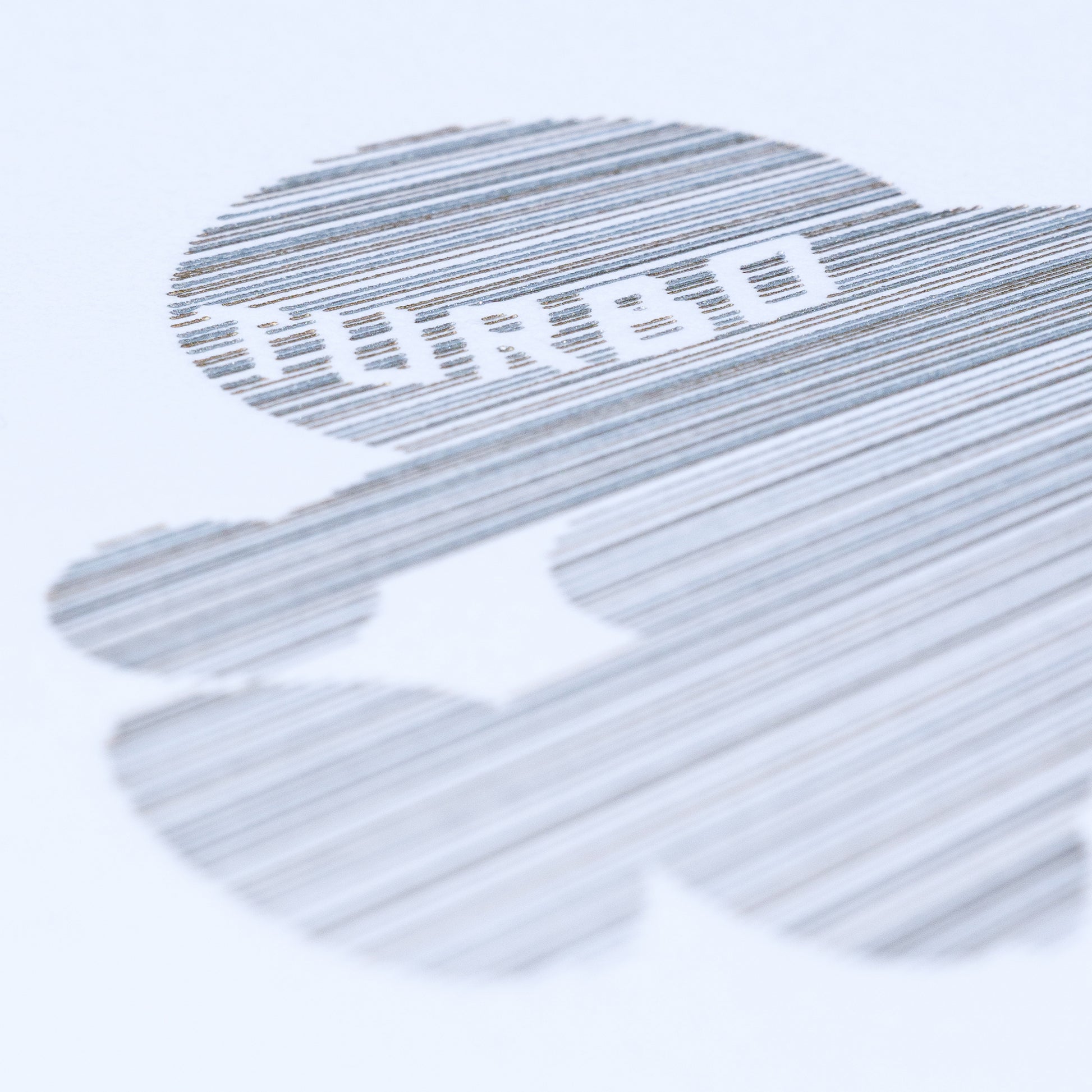 一度目の印刷で銀を刷り、二度目で金を刷るという二度刷りで完成しました。これだけ細かい直線ですから、二度目を刷る時に銀の部分と少しでもずれてしまうと、絵の輪郭やTURBOの文字が綺麗に出ないおそれがありましたが、そこは職人さんの腕前で見事に刷ってくれました。ぜひ、拡大してご覧ください。