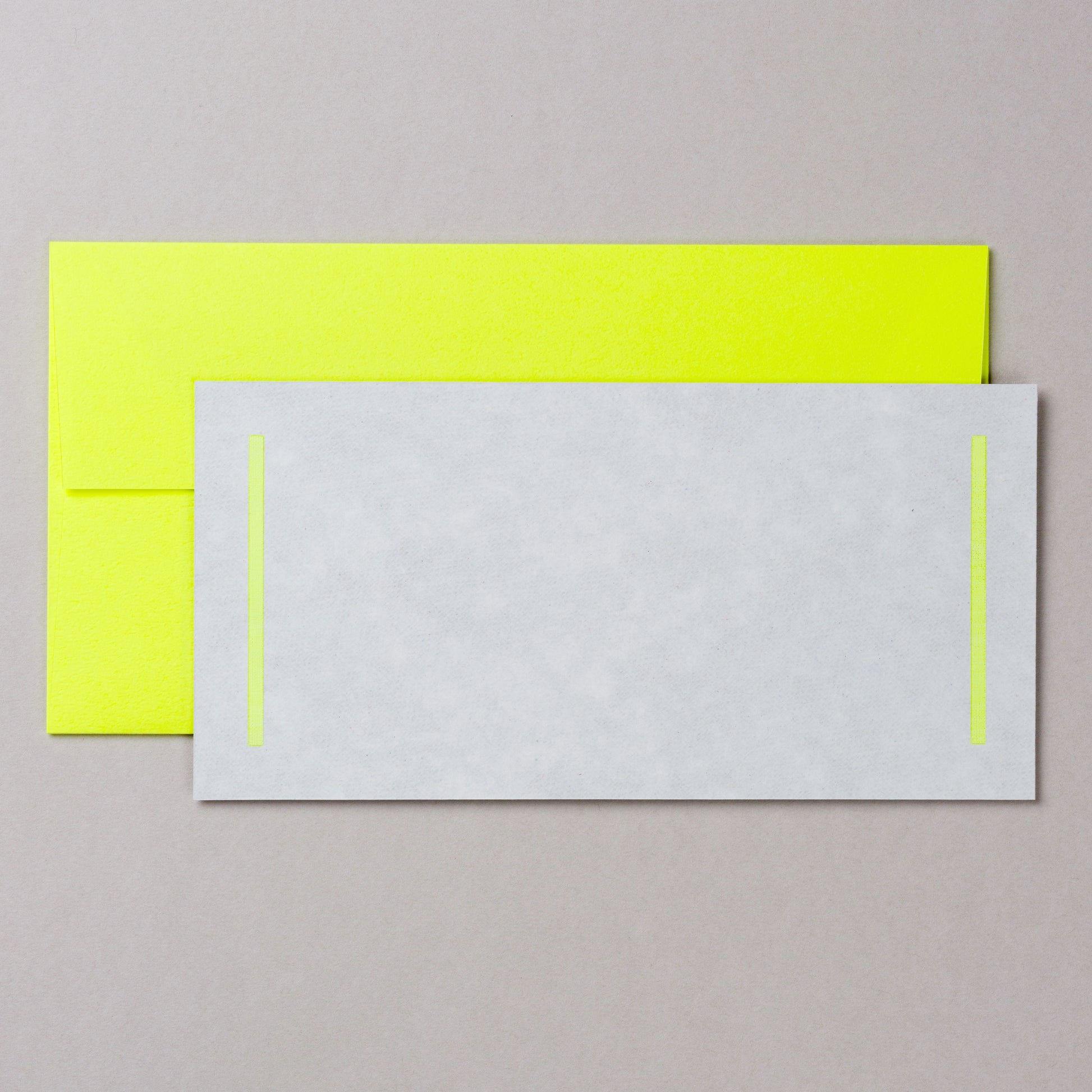 二本の蛍光イエローをアクセントにしたカードに、封筒は同じく蛍光イエローを合わせました。カードには表面がミルクの泡のようなホワイト色の板紙を使用。結構堅めでしっかりしています。白色インク→蛍光イエローの順にシルクスクリーンで重ね刷りし、二本のラインを引きました。