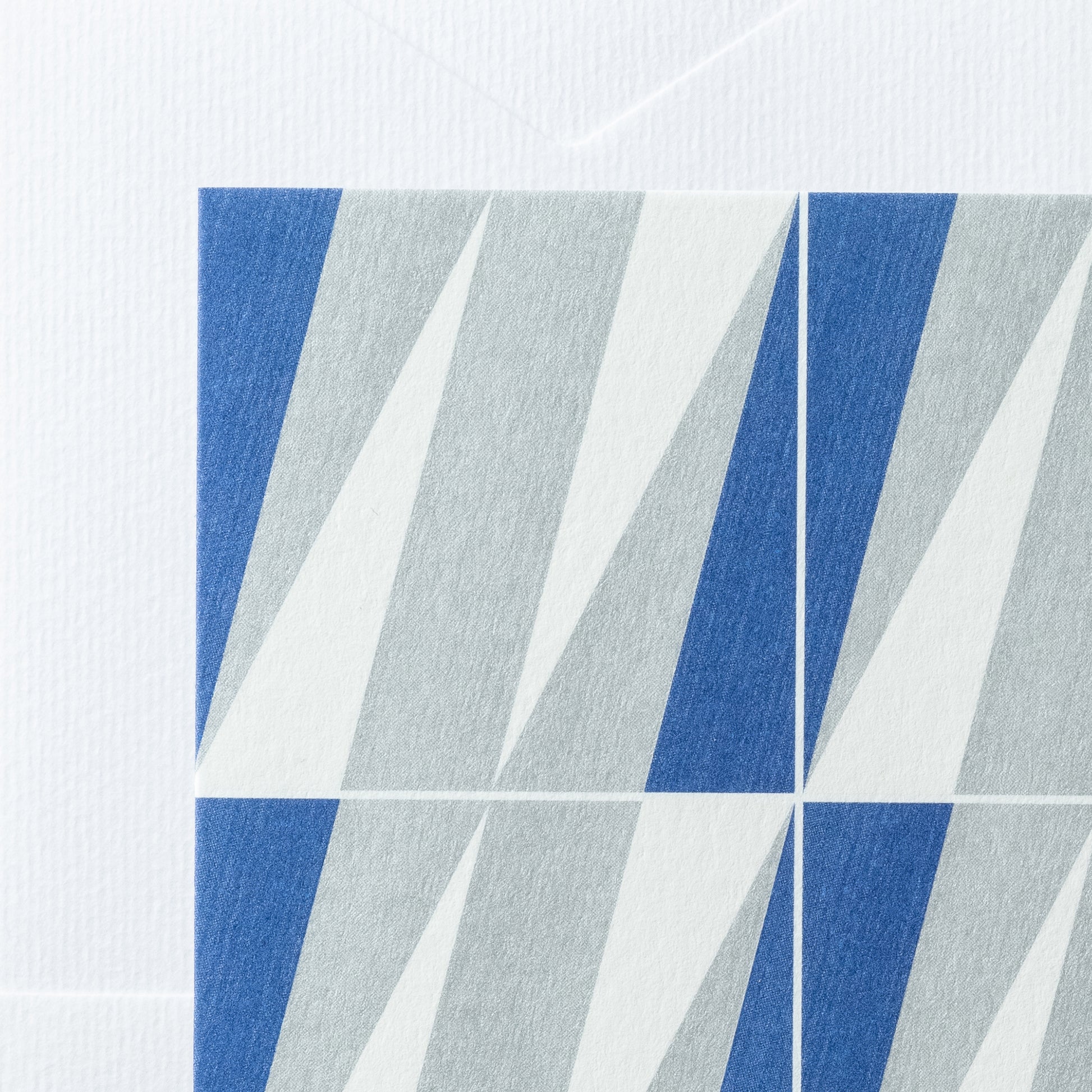 柄部分にはよく見るとわかるくらいの刷毛目状の細かい筋を入れており、それが青・銀・白の3色で印刷したシンプルな幾何学模様に深みを与えています。一方で、書く面はきれいな淡い水色です。筆記具を選ぶとすれば、黒だけでなく青系や銀のインクとも相性が抜群に良いと思います。