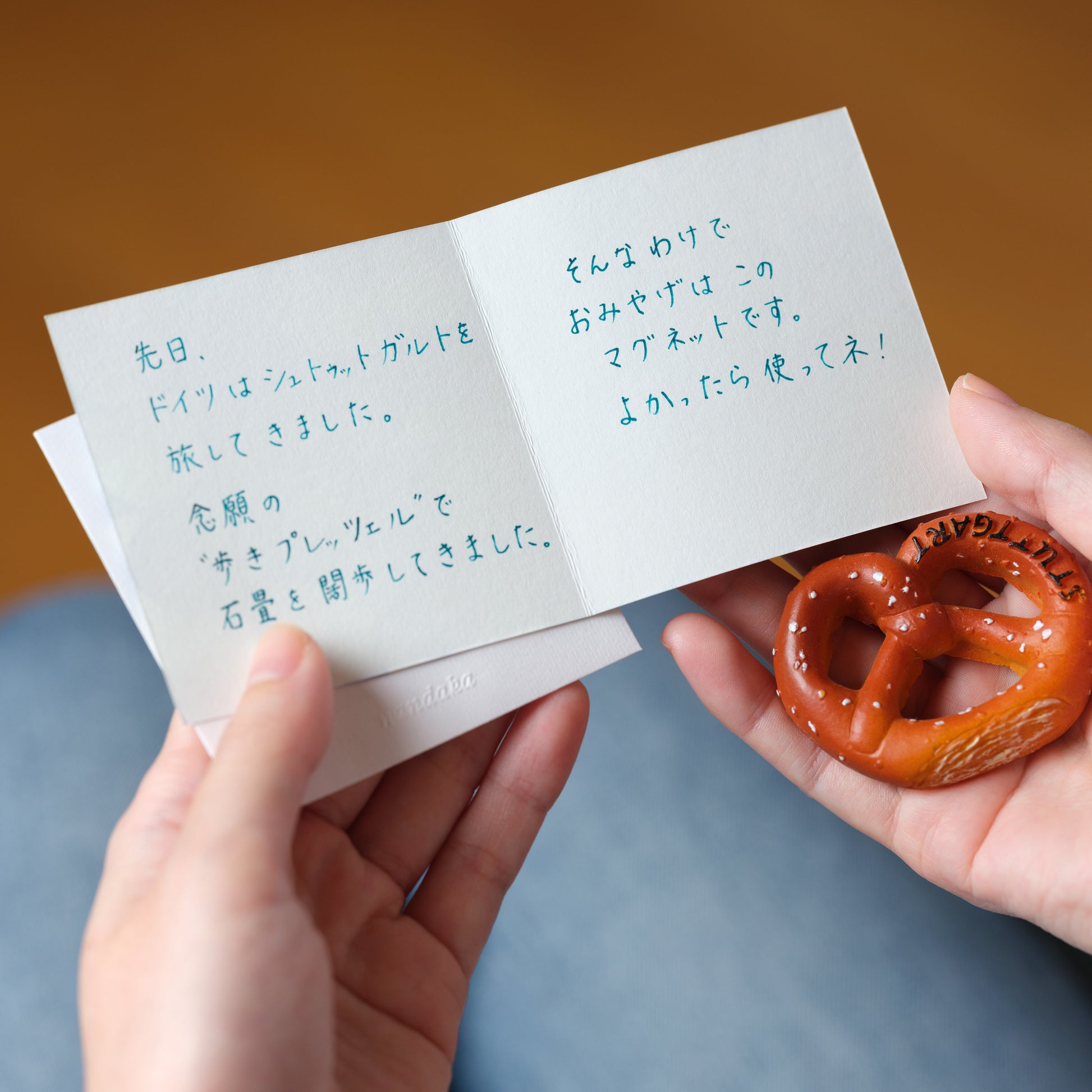 72.5mm四方の正方形という絶妙なサイズのカード。タイルを一枚お土産にあげるような感覚で気軽に送れるメッセージカードです。二つ折りなので、いわゆるミニカードよりも書ける面積が広くなっています。