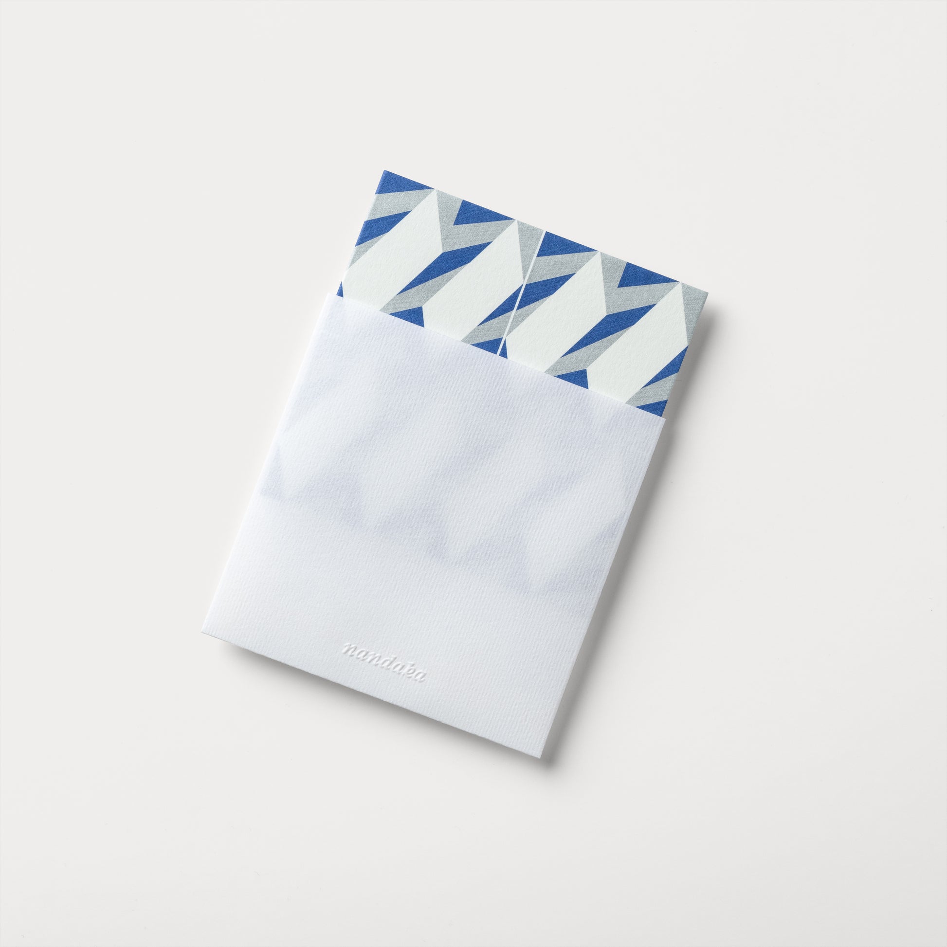 柄部分にはよく見るとわかるくらいの刷毛目状の細かい筋を入れており、それが青・銀・白の3色で印刷したシンプルな幾何学模様に深みを与えています。一方で、書く面はきれいな淡い水色です。筆記具を選ぶとすれば、黒だけでなく青系や銀のインクとも相性が抜群に良いと思います。
