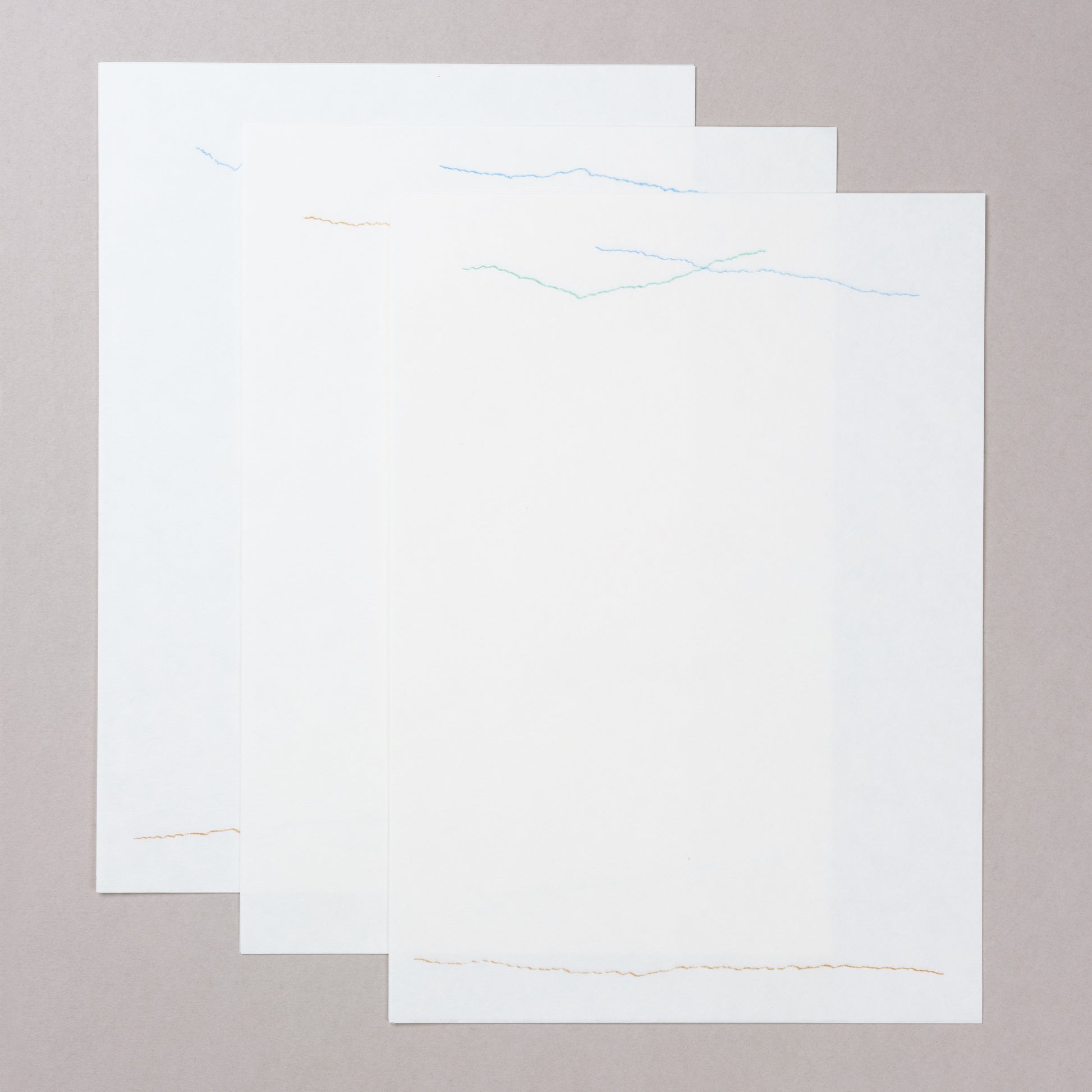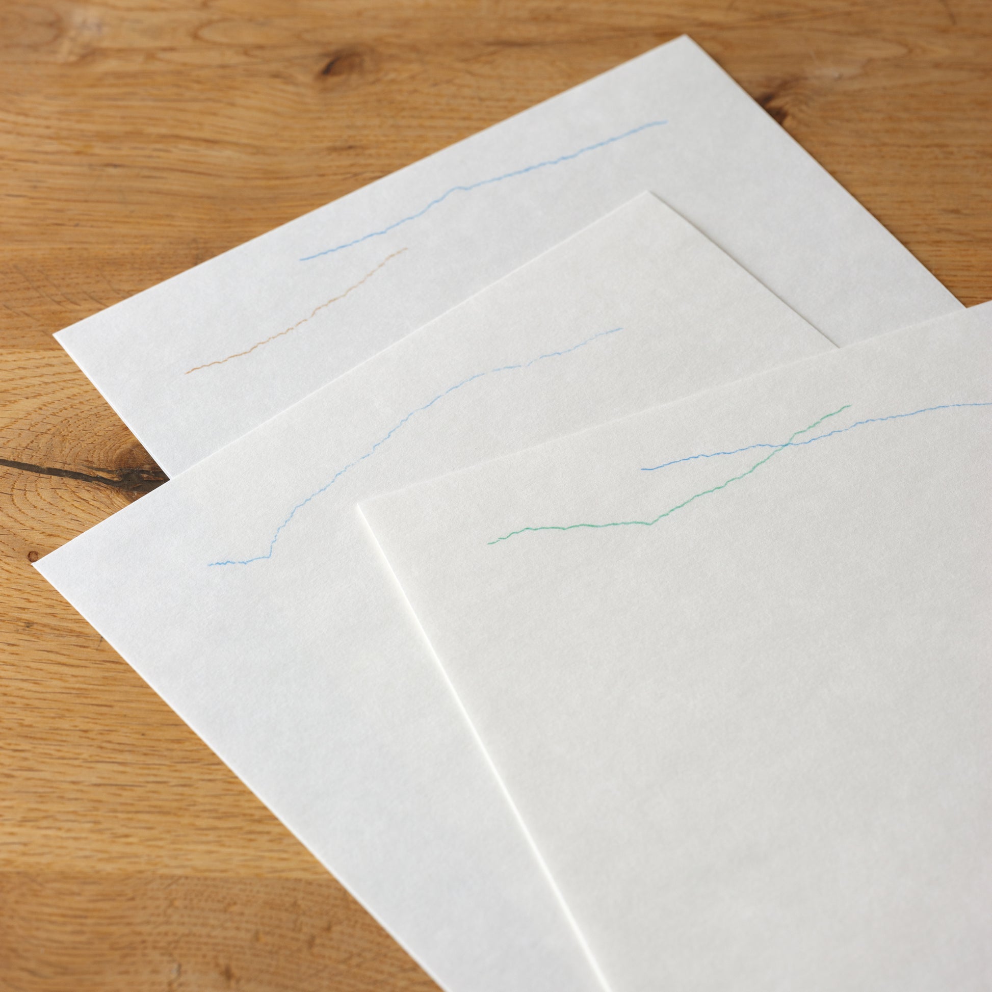 いい感じの線がたくさん描けたので、便箋は3パターン作りました。フリッターという羊雲のようなふわふわもこもこ感触のする紙に印刷しました。封筒もおそろいの紙を使用。